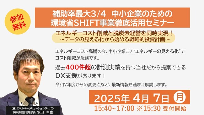 株式会社エネルギーソリューションジャパン(本社:東京都中央区、代表取締役:田崎 剛史、以下「ESJ」)は、2025年4月7日(月)に「環境省SHIFT補助金活用セミナー」をオンラインで開催いたします。本セミナーでは、令和6年度補正予算3,000百万円、令和7年度予算案2,786百万円で実施される環境省のSHIFT事業(脱炭素技術等による工場・事業場の省CO2化加速事業)について、最新の公募情報を踏まえた実践的な活用方法を解説します。