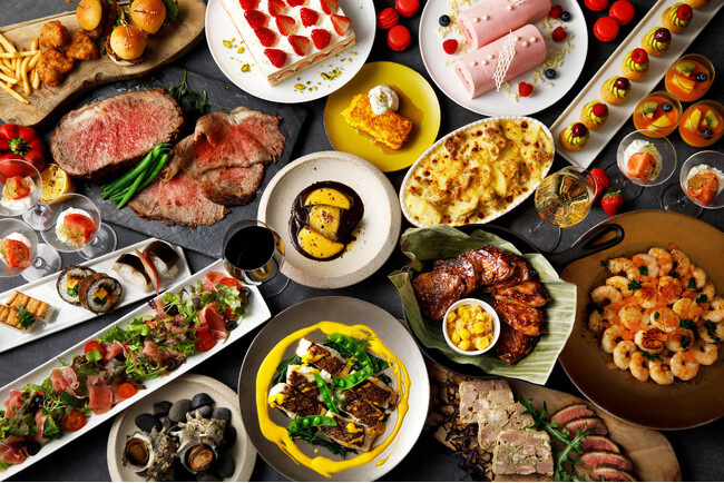 4月26日に迎えるホテル開業29周年を記念して企画した本ディナービュッフェでは、ライブキッチンから提供する出来立ての料理を充実させた、ライブ感あふれる料理の数々をご用意いたします。注目は、29年間の感謝を込めてシェフがお客様のテーブルを回り、目の前で仕上げて提供する「博多和牛の洋風しゃぶしゃぶ」(写真右)。コンソメスープにさっとくぐらせた博多和牛にウニを添え、1名様につき1皿を出来立てで提供いたします。出来立ての料理を提供するシェフズステーションでは、鹿児島県産和牛のローストビーフを切りたてで提供する他、伊万里牛の赤ワイン煮の炙り焼きや、くまもと黒毛和牛「和王」の自家製ボロネーゼのパスタをお客様の目の前で仕上げます。また、あまおうのコンポートを自家製のバニラアイスクリームに注いだストロベリージュビレとフレンチトーストを目の前で仕上げるデザートのカービングステーションもあり、周年記念に相応しい華やかなデザートが並びます。ミニバーガーを自分で作ることができるステーションやフライドチキンなどお子様向けの料理が並ぶキッズコーナーもご用意いたしますので、ご家族一緒にお楽しみいただけます。