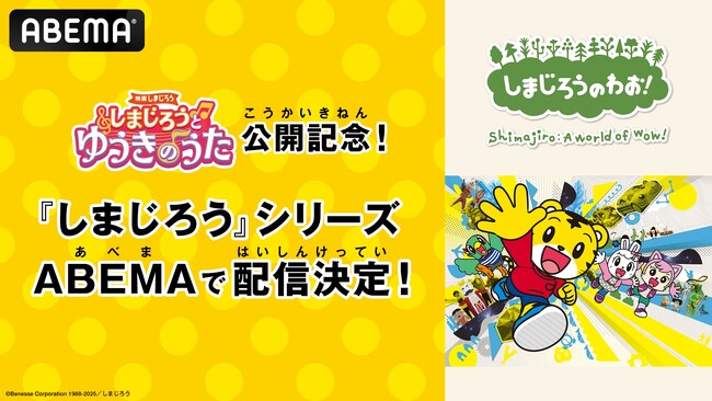 新しい未来のテレビ「ABEMA」は、大人気キッズ向けアニメ「しまじろう」シリーズの劇場版最新作「映画しまじろう『しまじろうと ゆうきのうた』」の公開に合わせ、2025年3月16日(日)から4週間にわたり、「しまじろう」シリーズを無料一挙放送いたします。