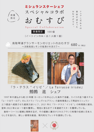 ミシュランスターシェフが手づから調理した具材を使ったミシュランおむすびを提供!八弾は 『ラ・テラス “イリゼ”』(奈良市)鷦鷯進シェフが手がける「とっとり琴浦グランサーモンのリエットおむすび」