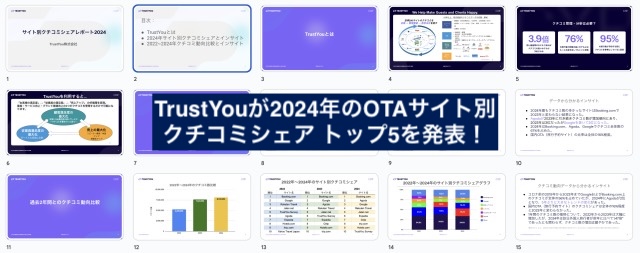 今回は、TrustYouのクチコミデータベースを用いて、2024年のサイト別クチコミシェアランキングとインサイトと2022年~2024年のクチコミ動向比較をまとめた資料を公開しました。日本国内の宿泊施設に関するクチコミレビューがどのOTAサイト(旅行予約サイト)にどの位集まっているのかを調査。その割合(シェア)をグラフにまとめ、インサイトと共にレポートとしてまとめました。
