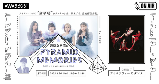 AWA株式会社(本社:東京都港区、代表取締役CEO:冨樫晃己)が運営する、サブスクリプション型(定額制)音楽ストリーミングサービス「AWA(アワ)」は、ユーザー同士がリアルタイムに、同じ空間で同じ音楽を楽しみながらチャットができるオンライン空間『LOUNGE(ラウンジ)』にて配信中の公式番組「東京女子流のピラミッド・メモリーズ」にフィロソフィーのダンスがゲスト登場します。