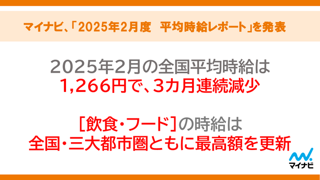 2025年2月の全国平均時給は1,266円で、3カ月連続減少。[飲食・フード]の時給は全国・三大都市圏ともに最高額を更新。「和歌山県」「奈良県」「滋賀県」の時給が前年比大幅増で、国際的な博覧会の影響か
