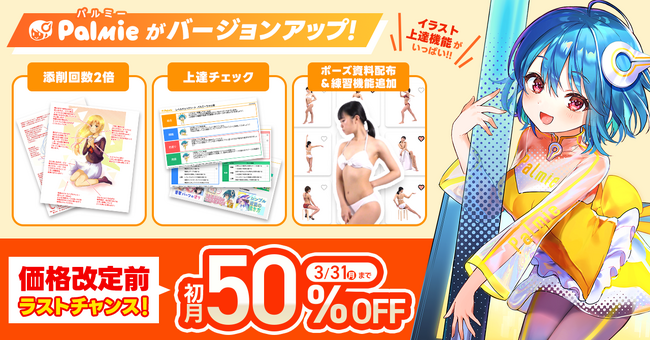 株式会社パルミー(所在地:東京都港区、代表取締役:大野英紀、以下パルミー)が運営するお絵かき講座パルミーは、より充実した学習体験の提供とクリエイターの皆様の成長を加速させるため、2025年4月1日よりサービス内容のバージョンアップと料金プランの改定を実施いたします。また、2025年3月14日12時より初月50%OFFキャンペーンを開催しております。
