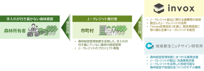 株式会社invox(代表取締役 横井 朗/以下、invox)と株式会社地域創生Coデザイン研究所(代表取締役所長 北山 泰三/以下、地域創生Coデザイン研究所)は、森林経営管理制度※1により市町村が経営管理を行う、これまで手入れの行き届いていなかった森林を対象としたJ-クレジット※2創出・活用の拡大に向け連携を開始しました。またあわせて、従来は採算が合いづらかった小規模山林でのJ-クレジットの取り組みも加速することで、持続可能な森林経営の更なる促進と地域創生の実現をめざします。