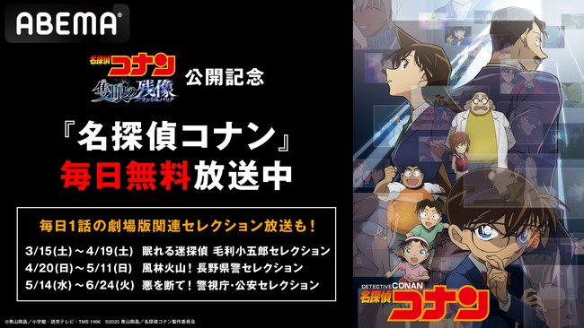 このたび「ABEMA」にて決定した、劇場版『名探偵コナン 隻眼の残像(フラッシュバック)』関連エピソードの無料放送では、2025年3月15日(土)からの「眠れる迷探偵 毛利小五郎セレクション」を皮切りに、「風林火山!長野県警セレクション」、「悪を断て!警視庁・公安セレクション」を、6月24日(火)までにわたり毎日1話ずつ順次無料放送いたします。なお全て放送後1週間、放送エピソードを無料でお楽しみいただけます。