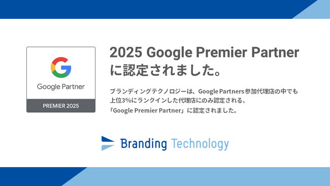 ブランディングテクノロジー株式会社(代表取締役社長:木村 裕紀、本社:東京都渋谷区、証券コード7067、以下当社)は、この度Google Partnersプログラムの2025年度 Premier Partnerのステータスを獲得いたしました。