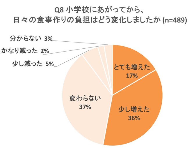 食事づくりの負担の変化を聞くと、53%が小学校にあがってから日々の食事づくりの負担が増えたと回答しました(Q8)。Q8で「負担が増えた」と回答した方に具体的に感じた負担を聞くと、49%が「買い出しに行く時間が取れない」、43%が「やることが多く食事づくりに時間がかけられない」「栄養バランスを考慮した食事づくり」と回答(Q9)。時間がないなかでも栄養バランスのよい食事をつくりたいという悩みが明らかになりました。