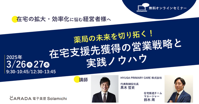 クラウド電子薬歴『CARADA 電子薬歴 Solamichi』の企画・開発・販売を行う株式会社ソラミチシステムは、薬剤師による在宅訪問、在宅訪問薬局のサポート事業を展開するHYUGA PRIMARY CARE株式会社の代表取締役社長 黒木哲史氏と同社マネージャーの鈴木周氏をゲストに迎え、無料オンラインセミナー「薬局の未来を切り拓く!在宅支援先獲得の営業戦略と実践ノウハウ」を2025年3月26日(水)、27日(木)19時より開催します。