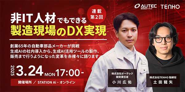 生成AIに関する研修・内製化支援事業を展開する株式会社TENHO(本社:東京都渋谷区、代表取締役:田村 允)は、3月24日(月)17時~、STATION Aiとオンラインの同時接続にて、製造業DXに関するセミナーを開催します。