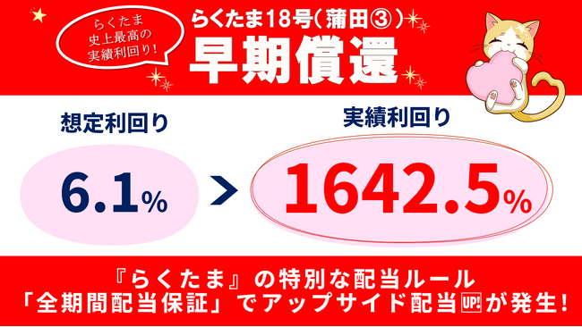 このような状況ではございましたが、出資者の皆様との契約に基づき、『らくたま』独自の配当ルールである『全期間配当保証』を適用させていただきました。その結果、18号ファンドの実績利回りは1642.5%という大幅な上昇を記録いたしました。