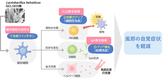江崎グリコ株式会社は、健常成人を対象としたヒト試験において、当社独自の乳酸菌Lactobacillus helveticus GCL1815株(以下、GCL1815株)を継続して摂取することで、風邪の自覚症状が抑えられることを明らかにしました。さらに、GCL1815株は、免疫で重要な役割を持つ2つの樹状細胞*の機能を高める可能性が示されました。