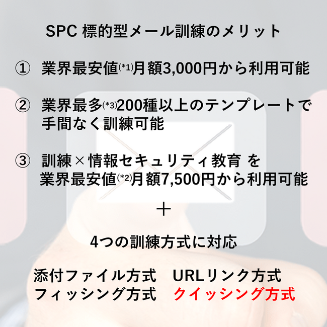 『SPC 標的型メール訓練 Basic』では、添付ファイル方式・URLリンク方式・フィッシング方式にクイッシング方式を加え、4方式の訓練が可能となり、業界最安値(*1)の月額3,000円から、業界最多(*3)200種以上の訓練テンプレートを活用することで、手間なく、多彩な方式で標的型メール訓練を実施することができるようになります。
