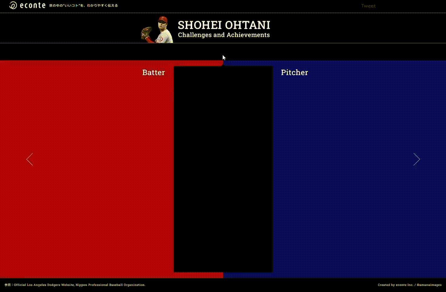 情報設計とクリエイティブで世の中の「いいコト」をわかりやすく伝える株式会社エコンテ(本社:東京都渋谷区、代表取締役:滝日伴則、以下「エコンテ」)は、ロサンゼルス・ドジャースの大谷翔平選手の「挑戦と軌跡」の体験型インフォグラフィック(動的なWebコンテンツとして表現)を制作・公開しました。