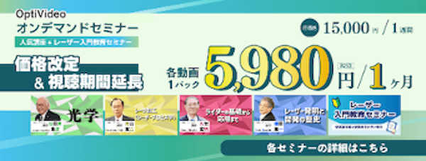 今回、OptiVideo会員数が1,000 名を超え、更なるサービス改善取り組みの一環として、人気講師4名のオンデマンドセミナー(1.光学(谷田貝 豊彦 講師)、2.レーザ加工 ―基礎と実際―(片山 聖二 講師)、3.ライダーの基礎から応用まで(久世 宏明 講師)、4.レーザー発明と開発の歴史(植田 憲一 講師))とレーザー・光学を新たに学ぶ方向けのレーザー入門教育セミナーを、従来の15,000円(税別)から5,980 円(税別)に大幅な価格改定を行いました。ご視聴期間も従来の1週間から1ヶ月に延長し、皆様の利便性・空き時間の活用に寄与できるようにいたしました。