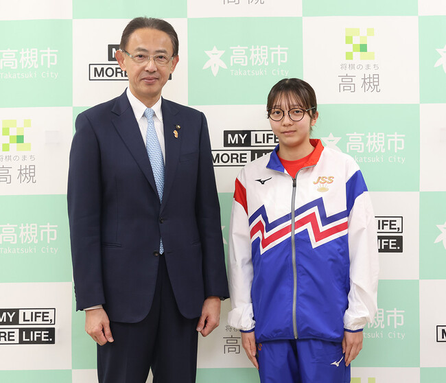 高槻市立第十中3年の山崎瑠花さんが水泳の日本選手権大会出場を市長に報告