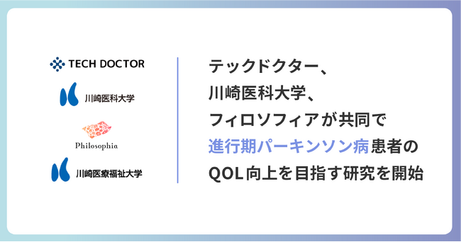 株式会社テックドクター(代表取締役:湊 和修、本社:東京都中央区、以下「テックドクター」)、学校法人川崎学園 川崎医科大学(岡山県倉敷市、以下「川崎医科大学」)、株式会社フィロソフィア(代表取締役:堅田 陽介、本社:大阪府大阪市、以下「フィロソフィア」)は、川崎医療福祉大学、倉敷脳神経内科クリニックの協力のもと、進行期のパーキンソン病(PD)およびPD類縁疾患* の長期共同研究を開始します。
