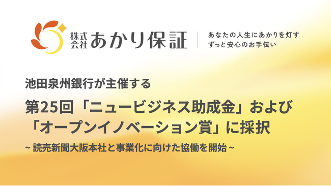 弁護士・司法書士・ケアマネジャー等の信頼できる専門家集団とともに、国のガイドラインを遵守して、高齢者向けの終身サポート・身元保証サービスを提供する株式会社あかり保証(所在地:大阪府大阪市北区、代表取締役:清水勇希、以下あかり保証)は、株式会社池田泉州銀行(本社所在地:大阪府大阪市、代表取締役頭取CEO:鵜川淳)が主催する第25回「ニュービジネス助成金」において、「優秀賞」および読売新聞大阪本社から社会実装に向けた連携機会等を提供する「オープンイノベーション賞」を受賞したことをお知らせします。この受賞により、読売新聞大阪本社とあかり保証は、身寄りのない高齢者に安心を提供する身元保証事業の事業化に向けた協働を進めてまいります。