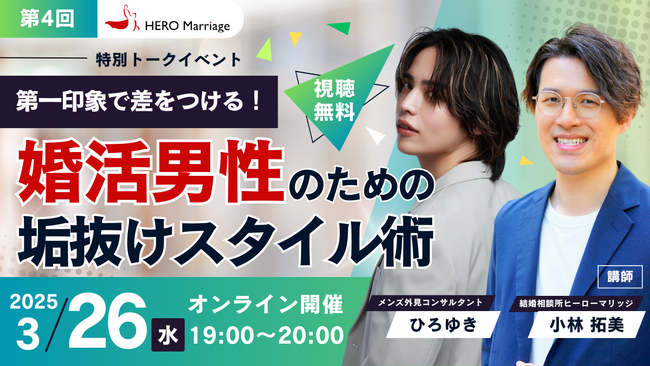 男性のための結婚相談所「ヒーローマリッジ」が、メンズ外見コンサルタントひろゆきさんと「婚活男性の垢抜けスタイル術」をテーマにした特別トークイベントを3月26日(水)に開催