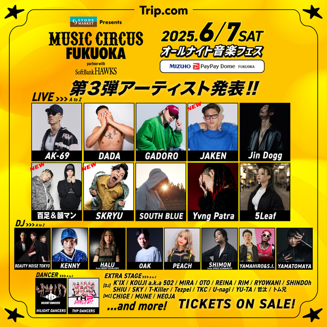 株式会社TryHard Japan(大阪市中央区)は、2025年6月7日(土)にみずほPayPayドーム福岡で開催されるオールナイト音楽フェス「STONE MARKET Presents MUSIC CIRCUS FUKUOKA partner with SoftBank HAWKS」の第3弾出演アーティストを発表いたします。