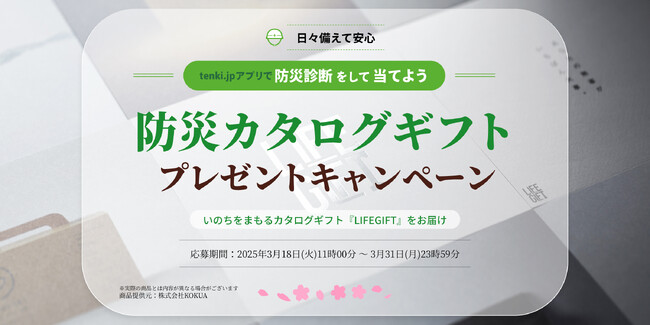 一般財団法人 日本気象協会(本社:東京都豊島区、理事長:渡邊 一洋、以下「日本気象協会」)は、天気予報専門メディア「tenki.jp(てんきじぇーぴー)」のアプリ利用者限定で、2025年3月18日(火)から「防災診断をして当てよう!防災カタログギフトプレゼントキャンペーン(以下、本キャンペーン)」を実施します。