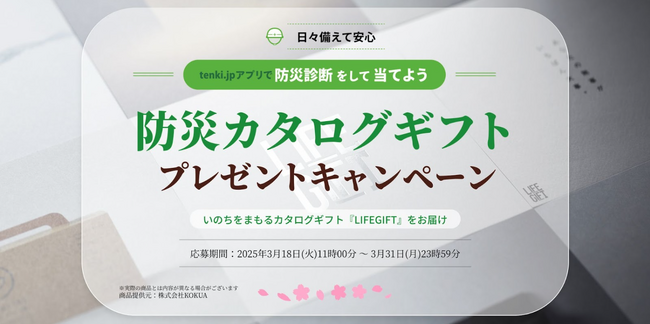 災害が頻発する日本において、防災対策は個人や家庭にとって重要ですが、何を準備すればよいのか分からない、あるいは準備が不十分な人が多いのが現状です。本キャンペーンでは、新生活を始める方が多いこの季節に、新生活の備え始めや見直しなど多様なニーズに応じて選べる「防災カタログギフト」を、「tenki.jp」のアプリを利用して「防災診断」を行った応募者の中から抽選で100名様にプレゼントいたします。これにより、アプリ利用者の満足度向上と防災意識の向上を同時に実現し、より多くの人々の安心な暮らしをサポートしてまいります。