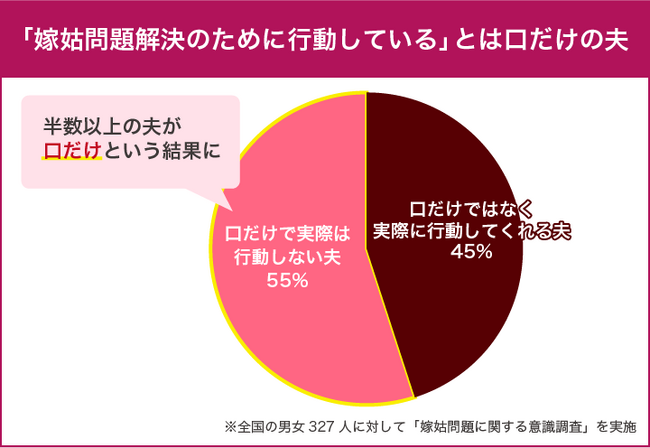 今回のアンケート調査では、『助けている』とは口だけで、夫は全然助けてくれないと感じている妻が55%いることが明らかになりました。つまり、半数以上の妻が夫の協力を十分に感じられていないことを示しています。