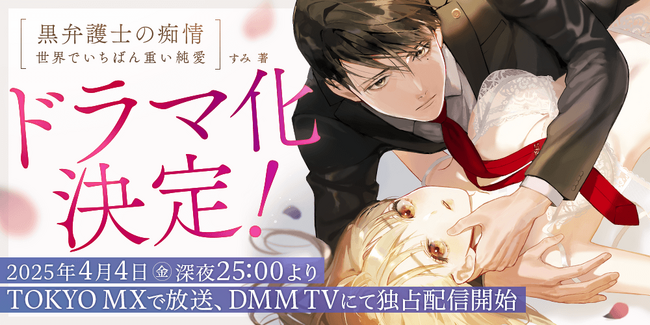 株式会社ぶんか社(本社:東京都千代田区、代表取締役:今晴美)の人気TLマンガ『黒弁護士の痴情 世界でいちばん重い純愛』(すみ著)がドラマ化決定! 4月4日(金)深夜25:00よりTOKYO MXで放送、DMM TVにて独占配信開始。
