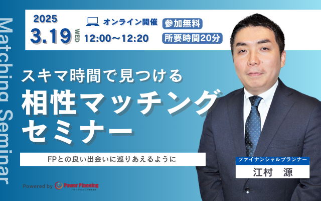 3月19日 (水)12時より、スキマ時間を活用して自分に合ったFPを探すことができる、 江村 源講師との「相性マッチングセミナー(無料)」を開催いたします。