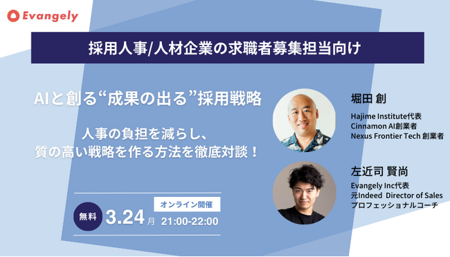 Evangely株式会社(所在地:東京都渋谷区、代表取締役:左近司賢尚 以下、Evangley)は、AIの専門家 堀田 創 氏とともに、採用市場におけるAIの活用に関する最新のトレンドや実践的な採用戦略設計について議論するウェビナー(参加無料)を開催いたします。