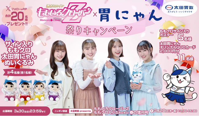 株式会社 太田胃散(本社:東京都文京区/代表取締役社長:太田淳之)は、「ももクロ×胃にゃん祭りキャンペーン」として、ももいろクローバーZのメンバー、百田夏菜子さん・玉井詩織さん・佐々木彩夏さん・高城れにさんの「太田胃にゃんぬいぐるみ」や、メンバー全員のサイン入り「太田漢方胃腸薬II【傘篇】のポスター」、「太田胃散オリジナルQUOカード 2,000円分」が当たるキャンペーンを実施します。同社の「太田胃散presents ももいろクローバーZ ももクロくらぶxoxo 春の増刊号」<パーソナリティ:ももいろクローバーZさん>の放送を記念しての企画となっておりますので、ぜひ番組とともにチェックしてください。