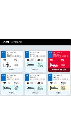 OKIが開発した「WatchOverSmart」は、高齢者の状態を常時把握し、危険の兆候を察知した際は、適切な情報を確実に介護職員へ伝達することで、介護される側と介護する側の双方における負担軽減を実現する高齢者見守りソリューションです。これにより、介助が必要な方が一人でベッドを離れようとする危険状態や深夜にベッドを離れて戻らないなどの不自然な状態を即時に把握することができます。