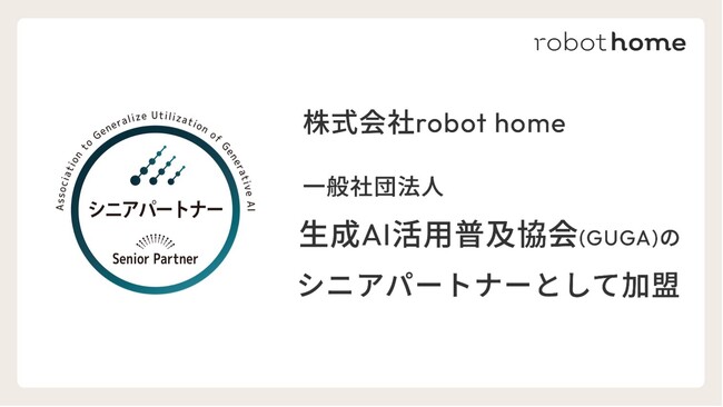 株式会社robot home(本社:東京都中央区 / 代表取締役CEO:古木 大咲 / 証券コード:1435 以下当社)は、2025年3月6日に一般社団法人生成AI活用普及協会(以降、GUGA)の法人会員(シニアパートナー)へ加入したことをお知らせいたします。