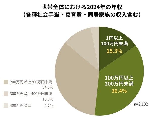回答者の世帯全体における2024年の年収(各種社会手当・養育費・同居家族の収入含む)について回答を得た結果、世帯年収が200万円に満たない回答者が5割に及びました。