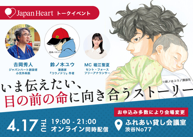 本イベントは、リアルな産科医療の現場を描きドラマ化もされた人気医療漫画『コウノドリ』の作者で漫画家の鈴ノ木ユウ氏をゲストに招き、「ジャパンハートの医療の信条」と「コウノドリの世界観」に共通する“目の前の命のストーリー”をテーマに、ジャパンハートの創設者として30年間途上国の医療現場で活動を続ける小児外科医・吉岡秀人との対談を繰り広げます。