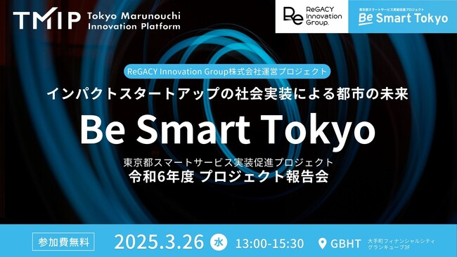 ReGACY Innovation Group株式会社(本社:東京都千代田区、代表取締役:成瀬巧一、以下:ReGACY)はオープンイノベーションプラットフォームTokyo Marunouchi Innovation Platform(以下、TMIP)と共催で東京都の「Be Smart Tokyo(東京都スマートサービス実装促進プロジェクト」の令和6年度プロジェクト報告会を3月26日(水)に開催します。