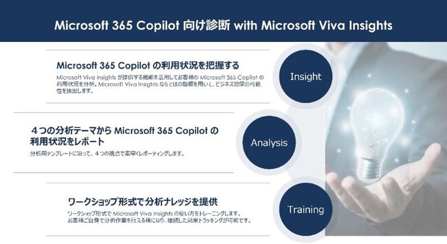 ※2 Microsoft Viva Insights:「Microsoft 365」の機能の1つで、従業員の生産性やウェルビーイングを向上させるための分析情報を提供するツール。「Microsoft 365」に蓄積されたデータから従業員のコミュニケーションに関する行動や傾向など「Copilot」の使用状況を分析することができる。