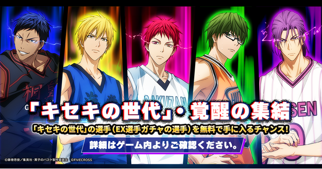 株式会社ファイブクロスは、アニメ『黒子のバスケ』の3Dバスケゲーム『黒子のバスケ Street Rivals』(黒バスSR)において、新機能『ホットゾーン』が実装されたことと、「キセキの世代」・覚醒の集結イベントを開催いたします。