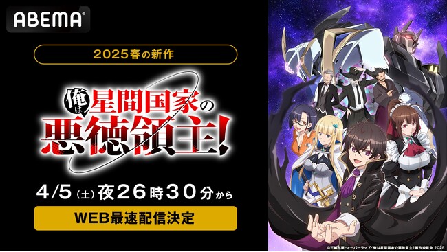 新しい未来のテレビ「ABEMA」は、2025年4月5日(土)から毎週土曜日夜26時30分より、新作春アニメ『俺は星間国家の悪徳領主!』をWEB最速配信いたします。