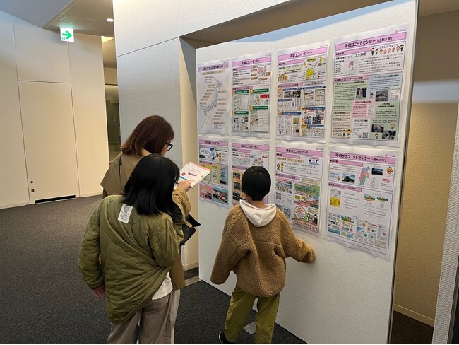 全国にあるエコチル調査ユニットセンターの取り組みを紹介するポスター展示も行いました。ポスターの前には、当日行われたクイズラリーのヒントを見つけるために熱心にポスターを見つめる子どもたちの姿が見られました。