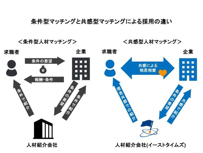 イーストタイムズが提供する「共感」を軸にした共感型人材マッチングサービスは、従来の条件重視の人材紹介とは異なり、企業・団体の理念や企業文化などの「本質的価値」と求職者自身の「価値と実現したい未来」を明確にすることで、採用過程および就職後のミスマッチを防ぎ、持続可能な雇用関係を実現します。