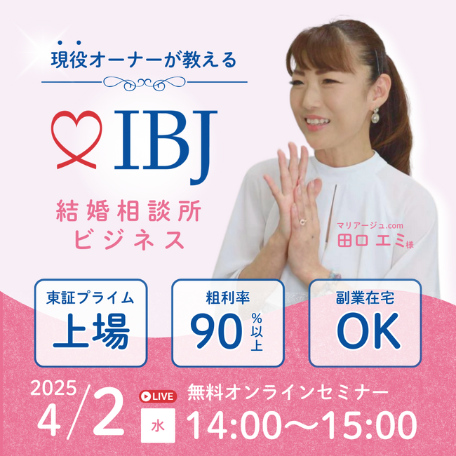 会員数・成婚数ともに国内最多*¹の株式会社IBJ(代表取締役社長:石坂 茂、本社:東京都新宿区、東証プライム:6071)は、2025年4月2日(水)に結婚相談所マリアージュ.com代表『田口 エミ』氏を講師にお招きし、「未経験からでも始められる結婚相談所ビジネス」をオンラインセミナーにて特別に公開いたします。