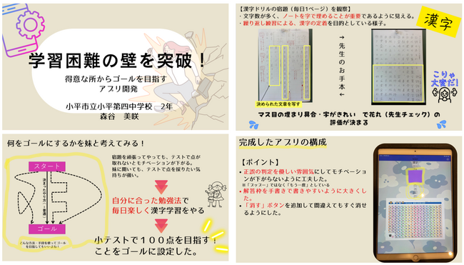 今回「すららネット賞」に選ばれたのは、小平市立小平第四中学校2年の森谷美咲さんです。受賞作品のタイトルは「学習困難の壁を突破!~ 得意な所からゴールを目指す アプリ開発 ~」。本作品は、読み書きに困難を抱える妹の学習を支援するために、自ら学習アプリを開発し、新たな学び方を提案した探究活動です。身近な課題に目を向け、丁寧な観察と分析を通じて問題の本質に迫り、実際に解決策を形にしていくプロセスが高く評価されました。