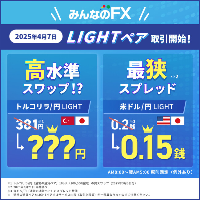トレイダーズホールディングス株式会社(東京証券取引所スタンダード市場8704)のグループ会社で、外国為替証拠金取引事業(FX取引)等を営むトレイダーズ証券株式会社(本社:東京都渋谷区、代表取締役:須山 剛、以下「トレイダーズ証券」)は、2025年4月7日(月)より外国為替取引サービス「みんなのFX」において新たな通貨ペア『LIGHTペア』の取扱いを開始いたします。