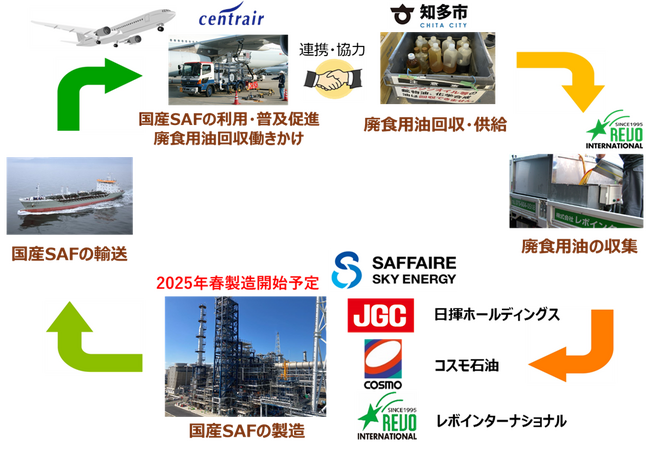 中部国際空港によって、近隣自治体である知多市と、国内で唯一の国産SAF量産設備を有するSAFFAIRE SKY ENERGY、出資者である日揮HDおよびレボインターナショナルの引き合わせがなされ、このたび、知多市の家庭等から排出される廃食用油を回収してSAFに資源循環させるための協定を締結することとなりました。