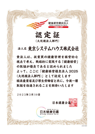 ITサービスを提供する東京システムハウス株式会社(本社:東京都品川区、代表取締役:林 知之、以下「当社」)は、経済産業省と日本健康会議が共同で選定する「健康経営優良法人認定制度」において、「健康経営優良法人2025(大規模法人部門)」に認定されました。当社は、2020年から6年連続で健康経営優良法人の認定を受けています。