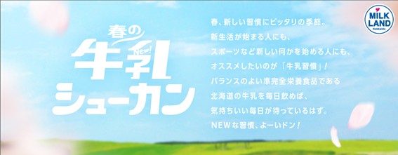 「ミルクランド北海道」 (運営事務局:ホクレン農業協同組合連合会)は、春休みを迎え学校給食で牛乳を飲む機会が減少することや新生活が始まる時期であることから、「春の牛乳シューカン」と題して、道内メディア(TV、新聞)やスポーツコンテンツを通じて、北海道産牛乳・乳製品のおいしさや栄養的価値を訴求し、春休み期間の牛乳消費量アップとともに、継続的な牛乳飲用習慣を発信・根付かせる企画を実施します。