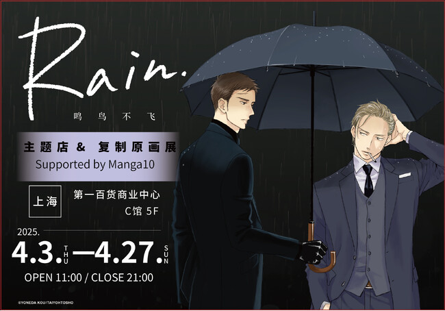 株式会社TORICO(本社:東京都千代田区 代表:安藤拓郎)が運営するマンガ展と、FirstMoverStudio の共同企画として、マンガ展にて2023年3月に開催したヨネダコウ先生『Rain ~囀る鳥は羽ばたかない コラボカフェ&複製原画展~』を2025年4月3日から中国・上海にてリバイバル開催することが決定しました。