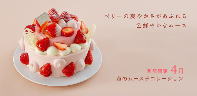 4月は苺の爽やかさがあふれる色鮮やかなムースとたまごのしっとり生地の2段ケーキ「苺のムースデコレーション」。