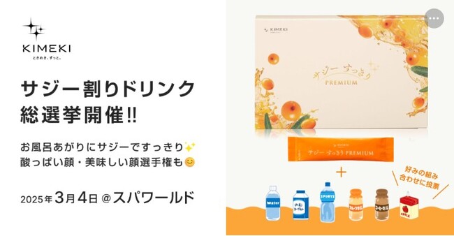 株式会社京福堂(本社:大阪府大阪市、代表取締役社長:関 崇樹)が提供するパウダー飲料『サジーすっきりPREMIUM』を展開するブランド「KIMEKI」は、2025年3月4日、スパワールド(SPAWORLD HOTEL&RESORT)にて試飲イベント「サジー割り総選挙」を開催いたしました。